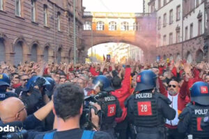 Saat 22.00’da başlayacak maç öncesinde Galatasaraylı taraftarlar Frankfurt kentini adeta esir aldı. Binlerce taraftarlar toplanmanın akabinde stadyuma yürüyüş gerçekleştirdi. Polisin ağır güvenlik tedbiri aldığı yürüyüş sırasında tezahüratlar Frankfurt sokaklarını inletti.