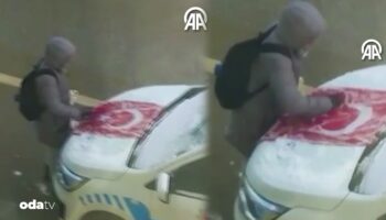 Bilecik'te ortaokul sekizinci sınıf öğrencisi bir çocuğun Türk bayrağının üstündeki karı temizlediği anlar yürek ısıttı. O anlar bakın kameraya nasıl yansıdı...