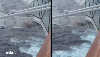 Yolcu gemisinde eğlenmek isteyen turist kabusu yaşadı.. Okyanusun 30 metre üzerindeki bir su kaydırağında mahsur kalan bir yolcunun çaresizce kendini kurtarmaya çalıştığı görüldü.