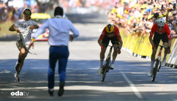 Fransa Bisiklet Tipi'nin 11. etabında bir protestocu, "İsrail Tur’dan çekilsin" tişörtüyle parkura girerek yarışı aksattı.