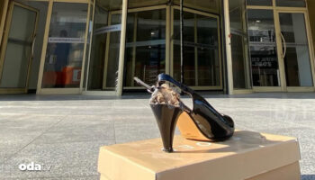 'Topuklu Efe' lakabı ile bilinen Aydın Büyükşehir Belediye Başkanı Özlem Çerçioğlu'nun CHP'den istifa etmesinin akabinde bir vatandaş belediye binasının önüne topuklu ayakkabı bıraktı.
