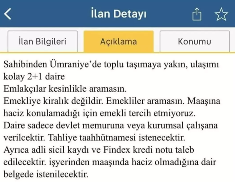 İstanbul’un Ümraniye ilçesindeki 2+1 daire için mesken sahibinin yazdıkları dikkat çekti. Konut sahibi, yalnızca devlet memuru ve kurumsal çalışanların başvurmasını istediğini belirtti. Ayrıyeten meskeni kiralamak isteyenlerden tahliye taahhütnamesi, isimli sicil kaydı, Findex kredi notu ve maaşında haciz olmadığını gösteren evraklar talep etti.