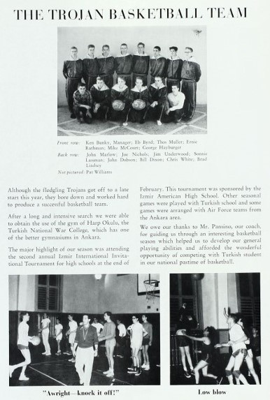 Amerikan Okulu’nun şimdi kurulduğu 1957-1958 yılında okul idaresi öncelikli olarak spor salonu arayışına girdi. Lakin Ankara’da o tarihlerde yalnızca Kara Harp Okulu’nun kapalı spor salonu var. Türk makamlarının da devreye girmesiyle Amerikan Okulu’na basketbol ve voleybol maçları için Kara Harp Okulu’nun kapalı spor salonu tahsis ediliyor. Amerikan Okulu’na yakın konumdaki Kara Harp Okulu Spor Salonu’nda “Trojans” olarak isimlendirilen Amerikan Okulu’nun basketbol grubu “ponpon” kızlar dayanağında hem idman yapıyor hem de ikili karşılaşmalar gerçekleştiriyor.