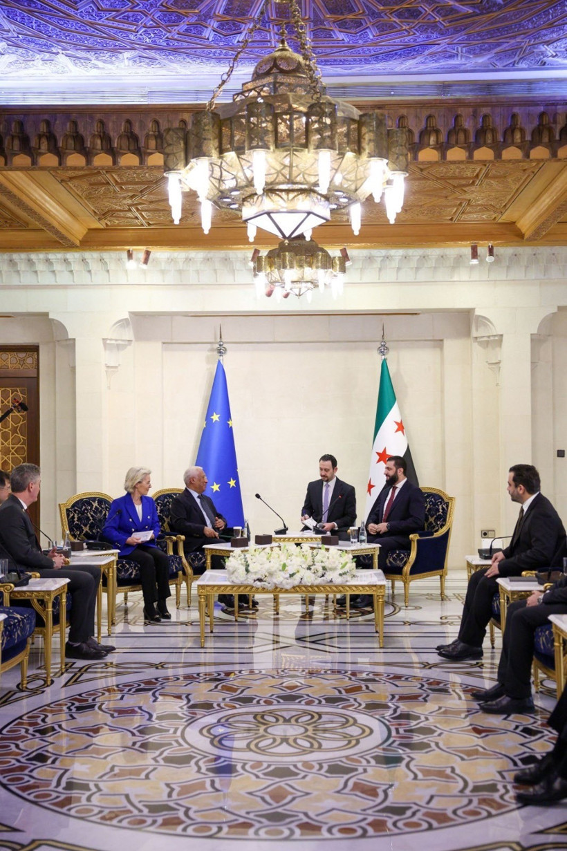 AB Konseyi Başkanı Antonio Costa ve AB Komitesi Lideri Ursula von der Leyen, Esad rejiminin devrilmesinden bu yana Suriye’ye birinci defa ziyaret gerçekletirdi. Costa ve Leyen, başşehir Şam’daki Halk Sarayı’nda Suriye Devlet Başkanı Ahmed eş-Şara ile görüştü. Görüşmede Suriye ile AB arasındaki iş birliği, Suriye’nin yine inşası, Suriye ve bölgede istikrar, Avrupa’daki Suriyeli mültecilere ait bahisler ele alındı.