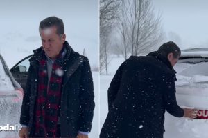 Arabasındaki karları temizlemeye koyulan Sarıgül, o anları kaydeden kameramanla şakalaşarak, “Senin yüzünden yolda kaldık, uğursuz adam.” dedi.