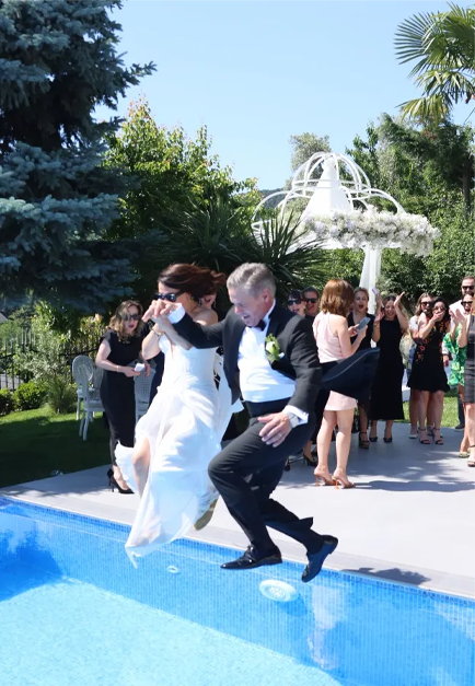 Çift hava çok sıcak olunca nikahın akabinde da bu sefer havuza atladı.