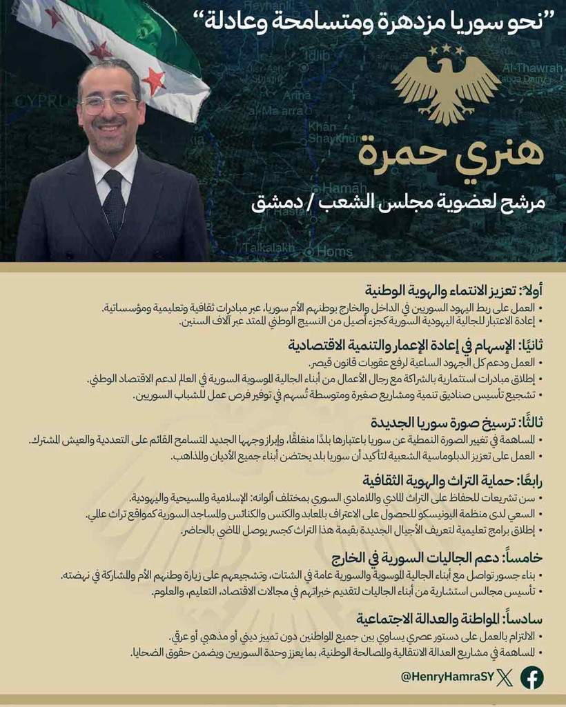 İsrail’in önde gelen gazetelerinden Yedioth Ahronoth, Suriye’deki yeni parlamento seçimleri öncesinde şaşırtan bir adaylığı sayfalarına taşıdı. Habere nazaran, New York’ta yaşayan ve Şam’ın eski hahamı Yosef Hamra’nın oğlu Henry Hamra, milletvekili adayı olmak için resmi müracaat yaptı.