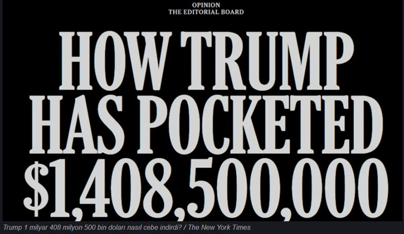 ABD’nin en tesirli gazetelerinden The New York Times, Donald Trump’ın ikinci devrinde başkanlık koltuğunu ferdî çıkarları için nasıl kullandığını mercek altına aldı. Gazetenin editoryal şura imzasıyla yayımlanan “Trump 1 milyar 408 milyon 500 bin doları nasıl cebe indirdi?” başlıklı başyazıda, Trump ailesinin kripto paralardan yabancı yatırımlara, medya mutabakatlarından yabancı devlet armağanlarına kadar uzanan gelir ağları kaleme alındı.
