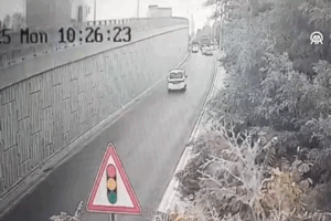 Görüntülerde, Ankara Caddesi 4. Sanayi Kavşağı’nda seyir halindeyken denetimden çıkan tırın, viyadükte asılı kaldığı anlar yer alıyor. Kayıtlarda, tırın sarktığı taraftaki alt yolda çok sayıda aracın trafik ışığında beklediği görülüyor.