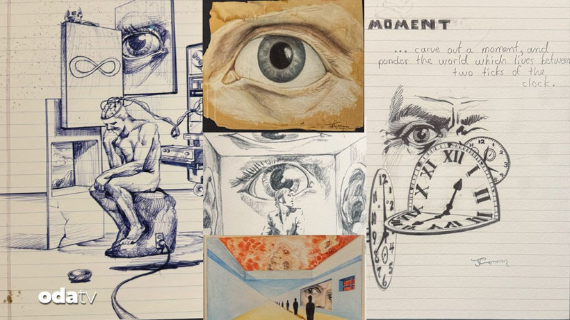Sergiyi dolaşırken en çok göze çarpan detaylardan biri, göz çizimlerinin çokluğu. Cameron’un defterlerinde onlarca göz tasviri ve ayrıntısı var; kimi tek başına bir bakış, kimi de dönüşüm geçiren yüzlerin odağı.