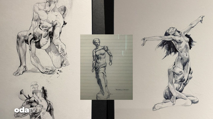 Beden çizimlerinde ise daima bir transformasyon motifi göze çarpıyor: insan-makine birleşimleri, tabiattan kopup tekrar şekillenen figürler ya da yarı-insan, yarı-uzaylı varlıklar…