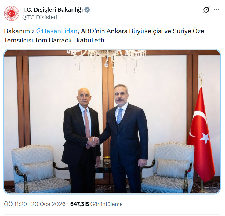 Dışişleri Bakanlığı’nın resmi X hesabından yapılan paylaşımda, “Bakanımız Hakan Fidan, ABD’nin Ankara Büyükelçisi ve Suriye Özel Temsilcisi Tom Barrack’ı kabul etti” denildi.