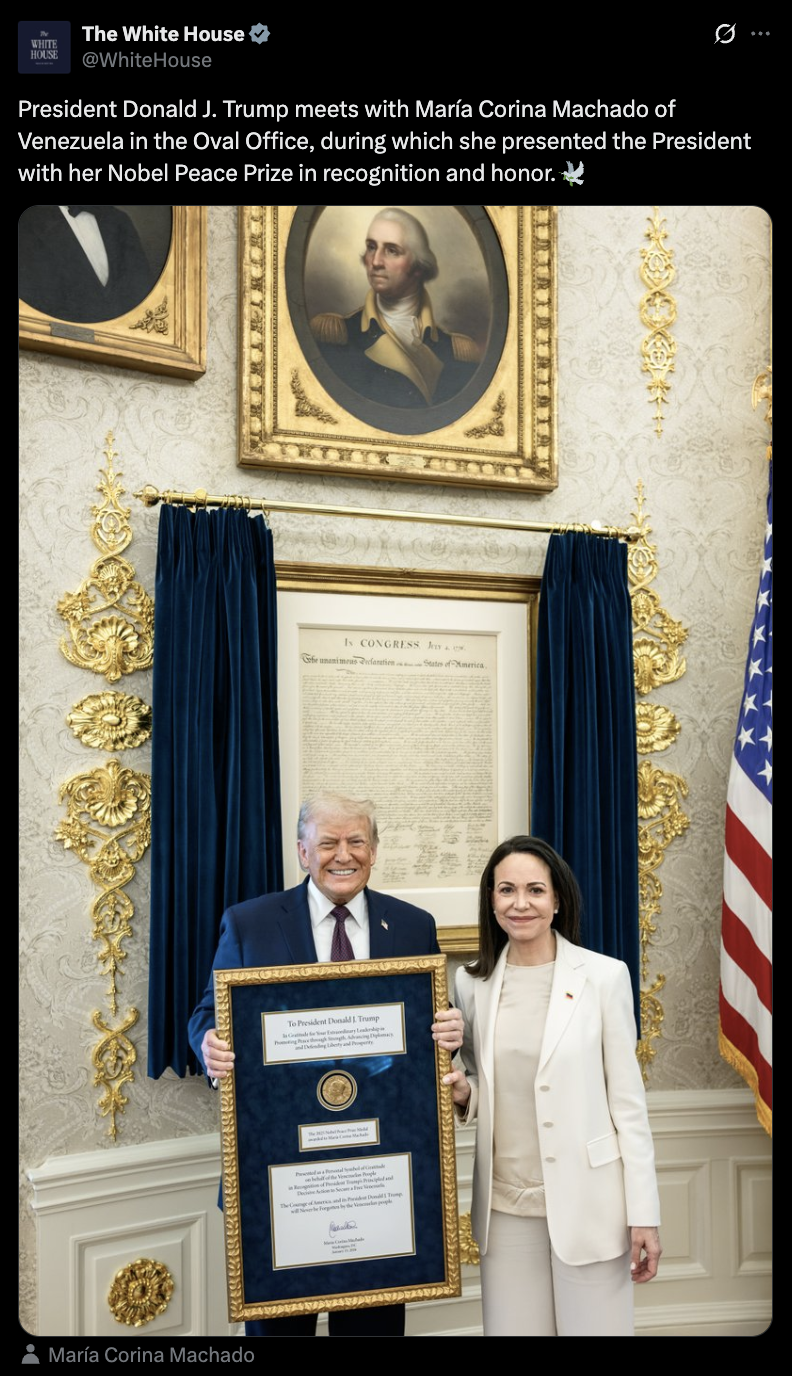 Trump, toplumsal medya paylaşımında Machado’nun jesti için teşekkür ederek bunun karşılıklı hürmetin olağanüstü bir göstergesi olduğunu yazdı.