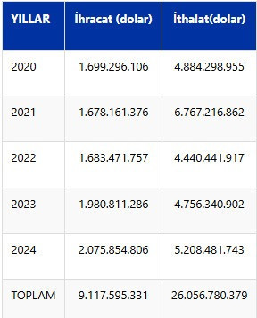 Bu sayı, 2023’te 1 milyar 980 milyon 811 bin dolara çıktı. İhracat, geçen yıl ise 2 milyar 75 milyon 855 bin dolar olarak gerçekleşti.