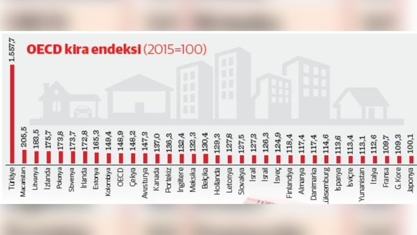 Dört çeyrek ortalamalarına nazaran yıllık kira artışı OECD ortalamasında yüzde 6,8 düzeyinde oluştu. Ortalamadan yaklaşık 10 kat daha fazla kira artışı yaşayan Türkiye, OECD ortalamasını da yükseltti.