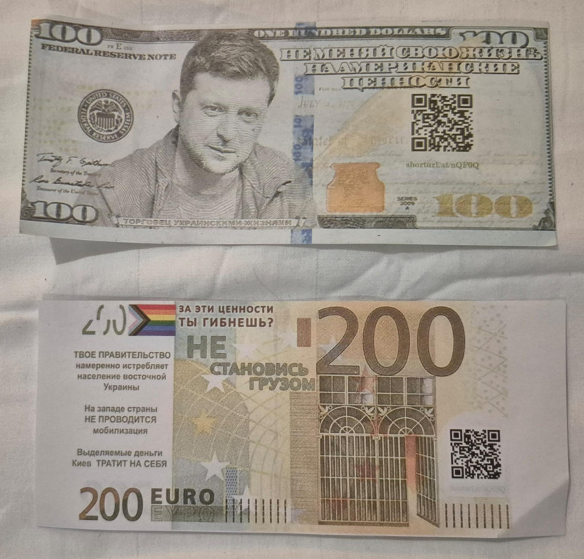 Koyu yeşil Amerikan dolarının üzerine basılan Zelenski’nin yanına ‘Ukraynalıların Hayatlarının Ticaretini Yapan’ ibaresi yerleştirilirken; “Amerikan doları için hayatını değişme? Batı, senin ülkeni poligon olarak kullanıyor. Hayatını pazarlama. Teslim ol” tabirleri yer alıyor.