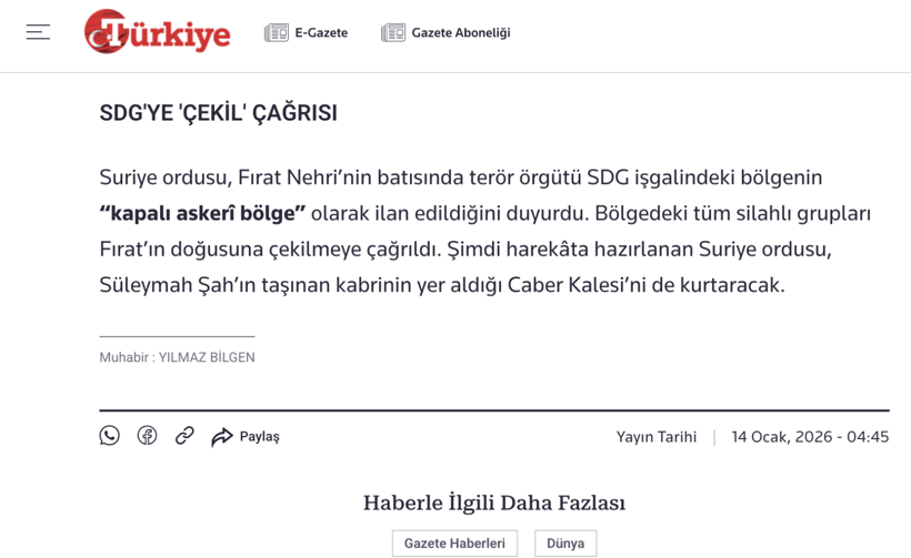 Haberin son paragrafında “Suriye ordusu, Fırat Nehri’nin batısında terör örgütü SDG işgalindeki bölgenin “kapalı askerî bölge” olarak ilan edildiğini duyurdu. Bölgedeki tüm silahlı kümeleri Fırat’ın doğusuna çekilmeye çağrıldı” tabirlerine yer verildi.
