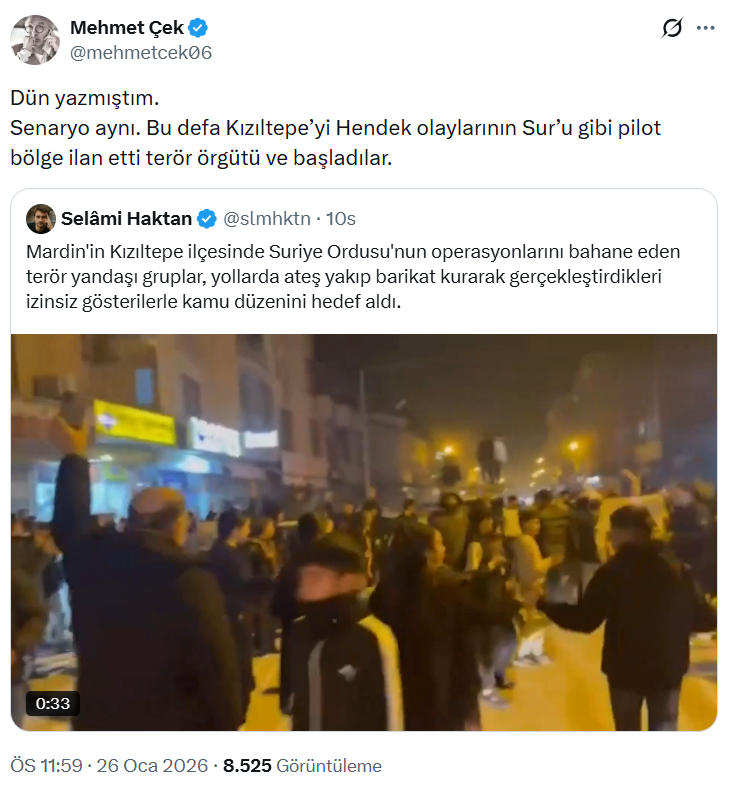 Gazeteci Mehmet Çek, X hesabından yaptığı paylaşımda Sur olayları ile olan benzerliği hatırlatarak, “Senaryo tıpkı. Bu kez Kızıltepe’yi Hendek olaylarının Sur’u üzere pilot bölge ilan etti terör örgütü ve başladılar” dedi.